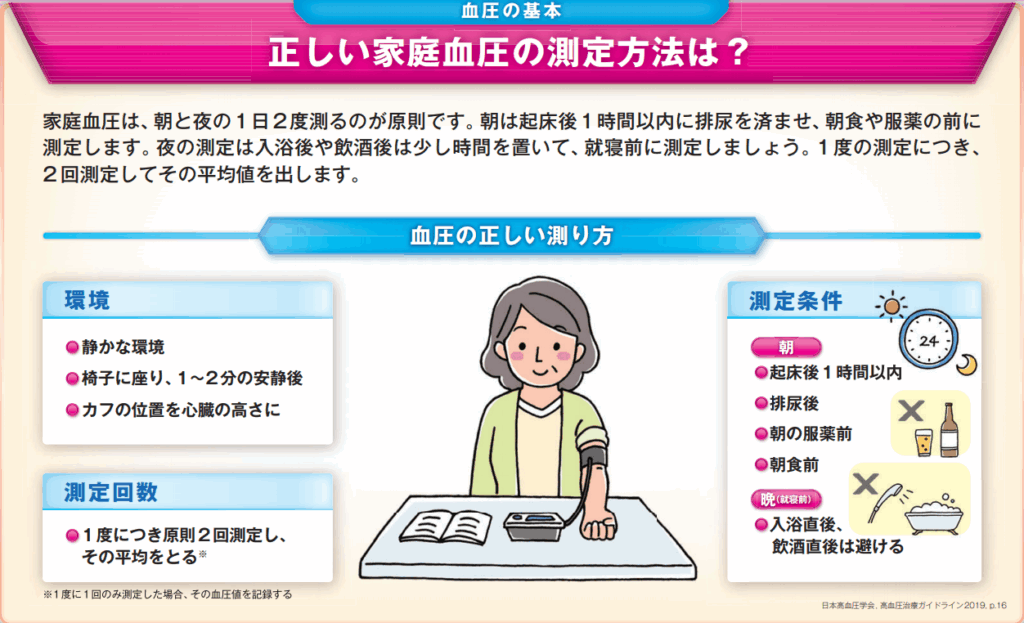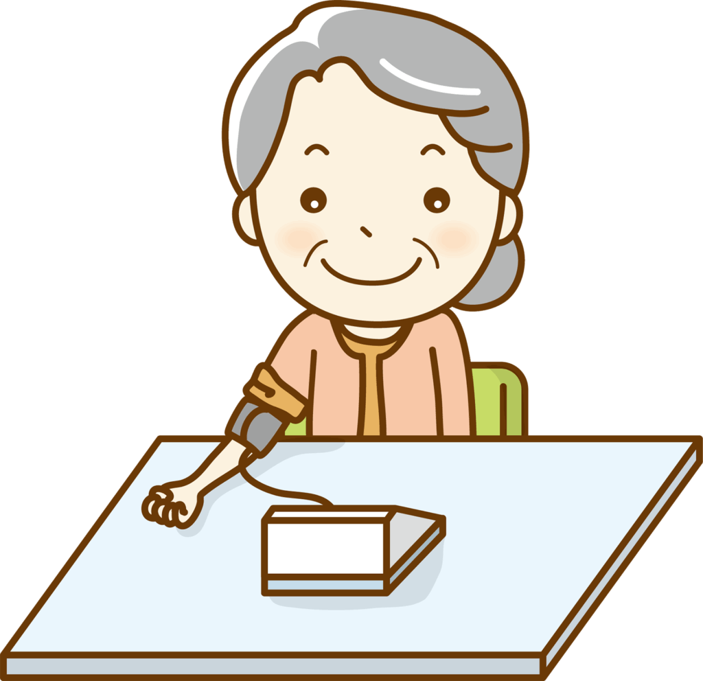 家庭で血圧を測定し、ノートに記録していただけると治療に非常に役立ちます。血圧の測定は朝、夜の1日2回、朝は朝食後、夕は就寝前の測定をおすすめします。