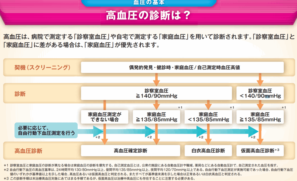 高血圧の診断は、下記の図のように診察室での血圧や家庭での血圧などで数値は異なりますが、おおむね140/90を超えてくると高血圧と診断されます。