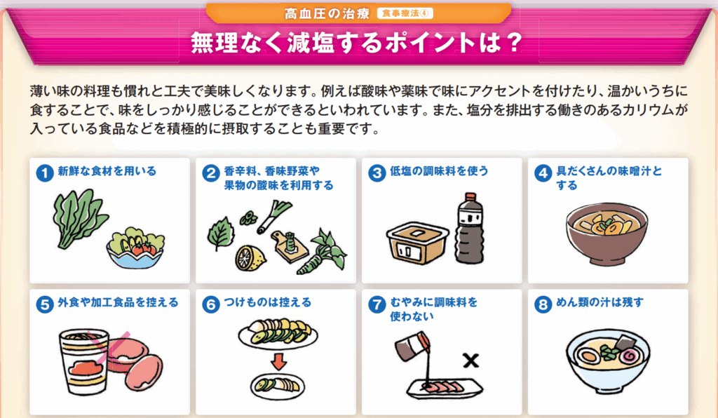 塩分の入っていない香辛料(ゆず、胡椒、七味)などを利用したり、調味料を減塩に変える。野菜を多くとる、麺類の汁を残すなどよく言われますね。