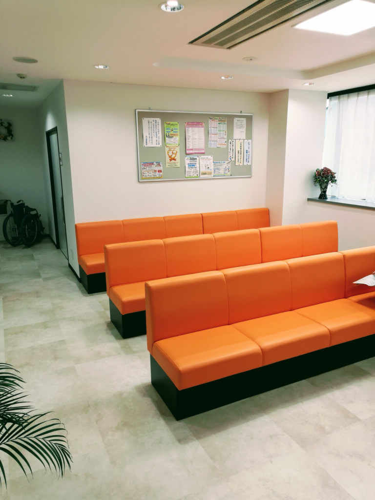 待合室です。オレンジが基調のソファへ変更しクリニックの入り口近辺にトイレを新設しました。