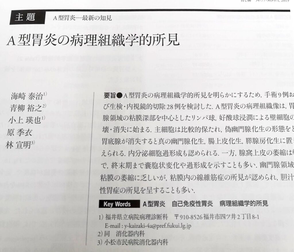 胃がんはピロリ菌の撲滅とともに今後20年から30年で劇的に減少する疾患です。その後に問題となるであろうA型胃炎の特徴に関しての論文でした。