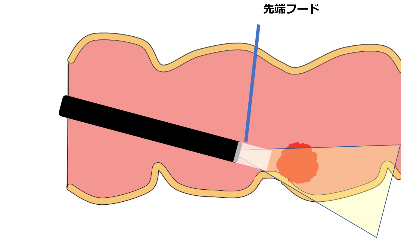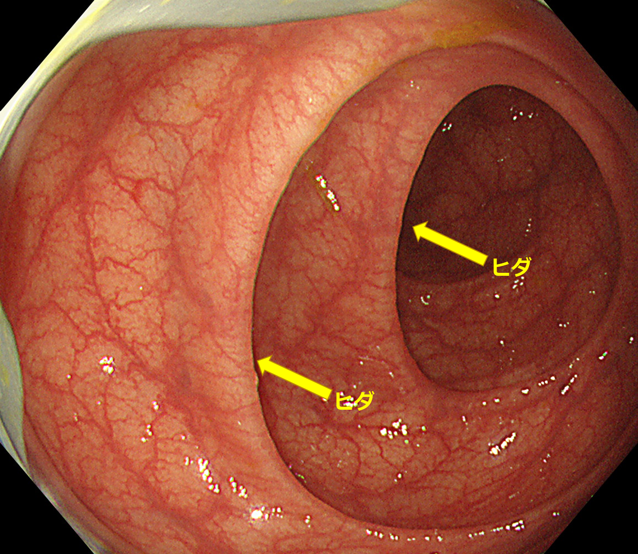 大腸という臓器は内腔にヒダが多く存在します。カメラで観察すると長いトンネルにふすまがたくさんあるように見えます。このヒダは中途半端に開いたふすまのようなっています。内視鏡は前方はよく見えますが真横などは死角となるため、このふすまの裏にあるポリープは見逃されがちです。