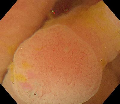 これは”腺腫“と呼ばれる腫瘍です。ですが良性の腫瘍ですので大きいものを切除の対象としています。この方は他に切除するポリープがあったためこのポリープもついでに切除しました。
