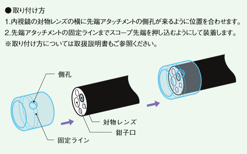 先端フードは図のようにカメラの先端に装着します。帽子の”つば”のようにヒダをめくるように観察が可能になります。