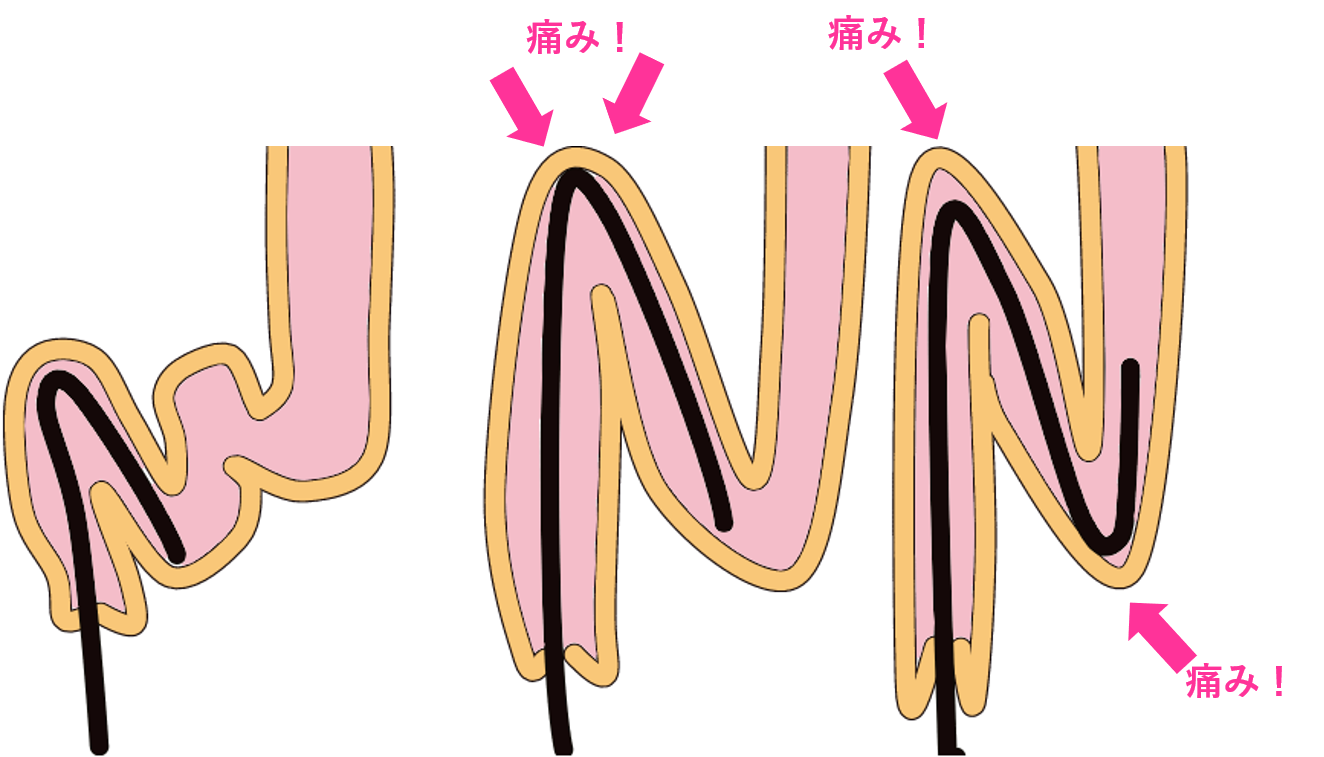 大腸粘膜には痛みの神経がありません。カメラがこすれる程度では痛みにはなりません。しかし下図のように、押し込むようにカメラ入れる場合には腸を突っ張る形になり、腸を引っぱったりするため痛みが強くなります。またカメラによる腸管穿孔(腸管が裂けてしまうこと)が起こりやすくなります。
