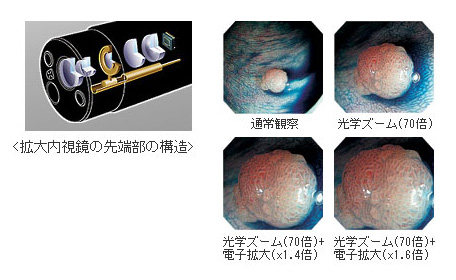 ひと昔前までは大腸カメラでポリープを発見した際には赤みが強いとか形がいびつといった大まかな見た目でがんか否かを判断していました。最近のカメラには拡大機能といってポリープの表面を顕微鏡で観察するような機能がついています。